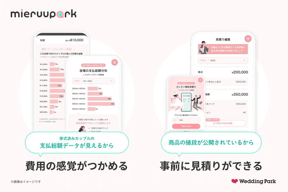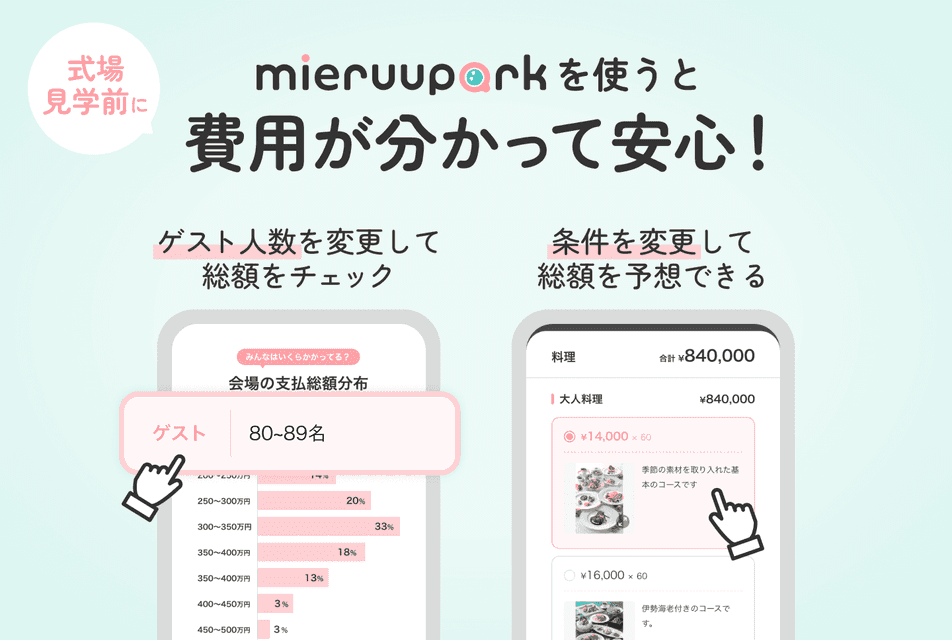 ラシュレディアコートでは、式場来館前におふたりで結婚式費用をシミュレーションできる「mieruupark」というサービスを導入しています。